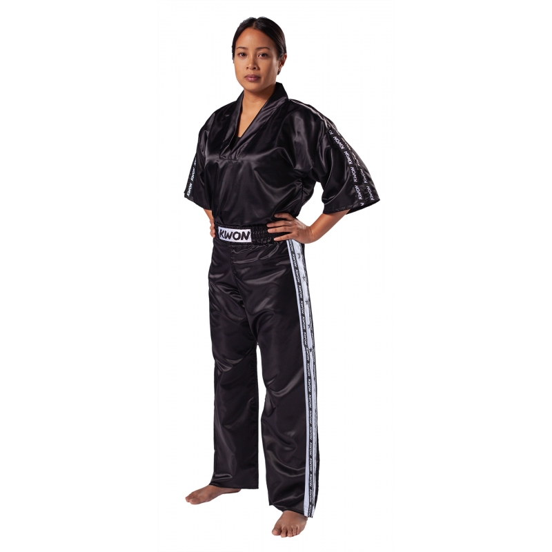 Sofistikovaná, profesionálně stylová kolekce ve vynikajícím zpracováním. Kalhoty mají 8 cm široký elastický pas v boxerském stylu se stahovací šňůrkou a po stranách mají prošívaný pruh. Velikou svobodu pohybu zajišťuje volný střih a klínek. Kalhoty jsou volné také v oblasti třísel. KWON saténové kalhoty mají přeplátované švy, aby se zabránilo roztrhání. Vyrobené v Německu.