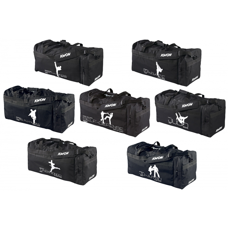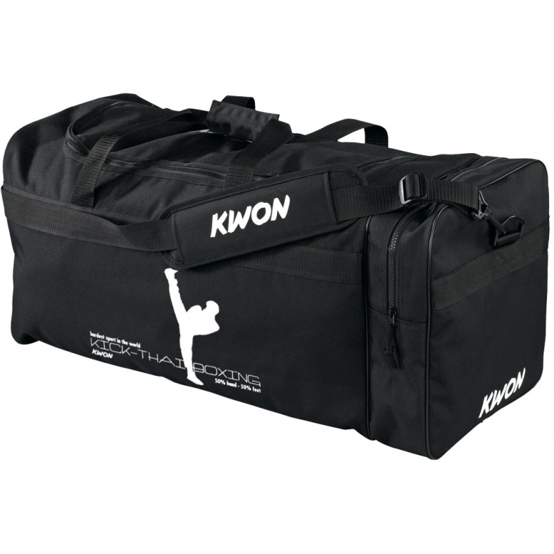 Velká taška KWON s motivem kick-thaiboxu v černé barvě má popruh přes rameno a dvě boční kapsy na zip. Tato taška je velmi prostorná - je ideální volbou na závody či soustředění.
